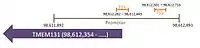 TMEM131 is located on the negative DNA strand (see Sense) of chromosome 2 from 98,372,799 - 98,612,354.[12] The gene product is a 6,657 base pair mRNA with 41 predicted exons in the human gene.[5] Ensembl predicts ten alternative splice forms, four of which are protein coding.[13] Promoter prediction and analysis was carried out using El Dorado[11] through the Genomatix software page.[14] The predicted promoter region spans 1002 base pairs from 98,611,892 through 98,612,893 on the minus strand of chromosome 2. The program predicted two potential transcriptional start locations. The first spans 216 base pairs from 98,612,501 through 98,612,716. The second spans 182 base pairs from 98,612,262 through 98,612,443.