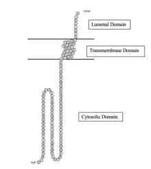 TMEM155 protein is 130 amino acids in length.[3] The TMEM155 protein in its full form is 14.2 kD in molecular weight with an isoelectric point of 10.29[7] Without its signal peptide it is 11.8 kD.[7] The protein interacts with the membrane once, with one transmembrane domain as seen below.