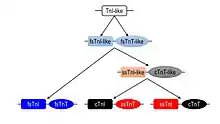 Three homologous genes have evolved in vertebrates, encoding three muscle type-specific isoforms of TnI.[8][9][10] Sequence analysis, immunological distance, and examination of evolutionarily suppressed conformational states showed that the TnI genes have evolved in close linkage with the genes encoding troponin T (TnT), another subunit of the troponin complex.[10] The fast TnI-fast TnT gene pair represents the original TnI and TnT genes (Fig. 1). The three muscle fiber type-specific TnI-TnT gene pairs were likely originated from a TnI-like ancestor gene that presumably duplicated to form a closely linked fast TnI-like and fast TnT-like gene pair. A later duplication events resulted in emergences of a slow TnI-like and cardiac TnT-like gene pair that was further duplicated to give rise of the present-day slow TnI-cardiac TnT and cardiac TnI-slow TnT gene pairs. The seemingly scrambled ssTnI and cTnI gene pair is actually functionally related as they co-express and form troponin complex in the embryonic heart. The overlapping of enhancer elements of the TnT gene promoter with the upstream TnI gene structure may be a critical factor in the preservation of the close linkage of TnI and TnT gene pairs[11]
