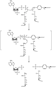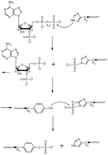A two-site ping-pong mechanism for TPST and the tyrosine sulfating has been proposed. PAPS enters one site of TPST and the sulfonate group is transferred to a Histidine residue in the enzyme and PAP is release. Then, the target protein and tyrosine bind TPST and the histidine transfers the sulfonate group to the target tyrosine.[11]