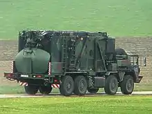 The crew shelter with integrated retractable mast is loaded onto a truck (Bundeswehr designation "Lkw 15 t mil gl BR"), but can also be dismantled to operate as a standalone trailer. A power generator is integrated on the unit. The crew consists of two or three surveillance radar operators.