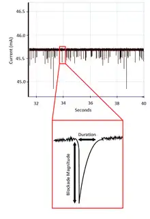 Particles crossing a nanopore are detected one at a time as a transient change in the ionic current flow, which is denoted as a blockade event with its amplitude denoted as the blockade magnitude. As blockade magnitude is proportional to particle size, accurate particle sizing can be achieved after calibration with a known standard. This standard is composed of particles of a known size and concentration. For TRPS, carboxylated polystyrene particles are often used.[5]