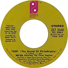 "TSOP (The Sound of Philadelphia)" is a 1974 hit recording by MFSB featuring vocals by The Three Degrees. A classic example of the Philadelphia soul genre, it was written by Gamble and Huff as the theme for the American musical television program Soul Train, which specialized in African American musical performers. The single was released on the Philadelphia International Records label. It was the first television theme song to reach number one on the Billboard Hot 100,[1] and it is arguably the first disco song to reach that position.