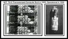 The TX-0, for Transistorized Experimental computer zero, but affectionately referred to as tixo (pronounced "tix oh"), was an early fully transistorized computer and contained a then-huge 64K of 18-bit words of magnetic-core memory. Construction of the TX-0 began in 1955[1] and ended in 1956.[2][3][4] It was used continually through the 1960s at MIT. The TX-0 incorporated around 3,600 Philco high-frequency surface-barrier transistors, the first transistor suitable for high-speed computers.[5] The TX-0 and its direct descendant, the original PDP-1, were platforms for pioneering computer research and the development of what would later be called computer "hacker" culture. For MIT, this was the first computer to provide a System console which allowed for direct interaction, as opposed to previous computers, which required the use of Punched card as a primary interface for programmers debugging their programs.[6] Members of MIT's Tech Model Railroad Club, "the very first hackers at MIT", reveled in the interactivity afforded by the console, and were recruited by Marvin Minsky to work on this and other systems used by Minsky's AI group.[7]