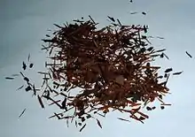 The inner bark is used in traditional medicine.[9] It is dried, shredded, and then boiled, making a bitter brownish-colored tea known as lapacho or taheebo. The unpleasant taste of the extract is lessened when taken in pill form, or as tinctures. Lapacho bark is typically used during flu and cold season and for easing smoker's cough. It is claimed to work by promoting the lungs to expectorate and free deeply embedded mucus and contaminants during the first three to ten days of treatment.[5]
