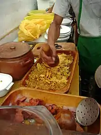 Tacacho is a traditional Peruvian meal that is typically served for breakfast. It is popular in the Amazonas region, where the natives boil or grill plantains, peel them, then mash them in a large wooden mortar. When mashed, the plantains are combined with lard, salt, and tiny pieces of pork rind and served with vegetables and chorizo on the side.[1]