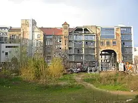 On April 4, 2011, the owner HSH Nordbank scheduled an eviction, but it was not carried out. Instead, on the next day, the "downstairs group" left the building peacefully in return for a payment of EUR 1 million from an anonymous source.[4] Eighty "upstairs" artists vowed to stay and continue to use their ateliers and metal workshops. One week later, the building's owner ordered an almost 3m tall wall to be built, separating Oranienburger Straße from the building's courtyard.[5]