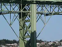 The original towers for the 1940 Tacoma Narrows Bridge featured four deep, box-shaped struts (two below the roadway and two above), as well as being tapered from being 50 feet (15 m) wide at the base to 39 feet (12 m) at the top. The new towers of the replacement span were to be the same width both at the bottom and the top, and were to feature a deep X-bracing system with three 45-foot-deep (14 m) single X-brace struts below the road deck and a series of three double-X brace struts of varying depths above the roadway (top being 23 ft 5 in (7.14 m), middle being 24 ft 6 in (7.47 m), and the bottom being 26 ft 6 in (8.08 m)). Tower construction began January 1, 1949, and progressed rapidly. Work went ahead of schedule and by April 1949, the 21-short-ton (19 t) steel cable saddles were prepared for lifting. On April 13, 1949, the north cable saddle on the east tower was bolted into place on a set of shims to allow workers to rivet the top plate into place. Then, disaster struck. That morning, an earthquake measuring 7.1 rattled the Puget Sound region. The earthquake caused the towers to sway 6 feet (1.8 m) from vertical, causing the cable saddle to shear its bolts and fall off the tower.[3][4][5] The saddle fell 510 feet (160 m) below. It missed the pedestal, and plunged straight through a barge, to a final resting spot 135 feet (41 m) below the surface of the Narrows, 75 feet (23 m) away from the pedestal. The resulting impact sank the barge, taking a compressor and numerous other tools with it. Divers soon located the cable saddle in a deep hole during a slack tide (the only time divers could operate, and slack tides only occurred at night). After a three-day delay, it was raised to the surface, repaired (the impact bent a corner on it), and reinstalled. The earthquake delayed completion of both the east and west towers on the bridge. After the earthquake's aftershocks subsided, work resumed, and by July 17 both towers were announced as being completed.