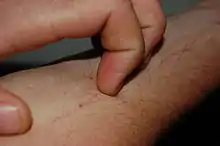 Tactile hallucination is the false perception of tactile sensory input that creates a hallucinatory sensation of physical contact with an imaginary object.[1] It is caused by the faulty integration of the tactile sensory neural signals generated in the spinal cord and the thalamus and sent to the primary somatosensory cortex (SI) and secondary somatosensory cortex (SII).[2] Tactile hallucinations are recurrent symptoms of neurological diseases such as schizophrenia, Parkinson's disease, Ekbom's syndrome and delerium tremens. Patients who experience phantom limb pains also experience a type of tactile hallucination. Tactile hallucinations are also caused by drugs such as cocaine and alcohol.[1]
