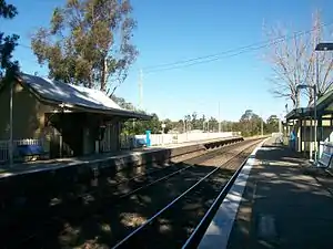 Tahmoor railway station is a heritage-listed railway station located on the Main South line in the town of Tahmoor, part of the Wollondilly Shire local government area of New South Wales, Australia. The property was added to the New South Wales State Heritage Register on 2 April 1999 where it is also known as the Tahmoor Railway Station Group and Lupton's Inn.[2] The station opened on 13 July 1919 at the same time as a new alignment between Picton and Mittagong railway stations.[3]