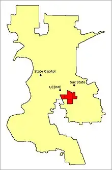 The area is less than 1-mile (1.6 km) southwest of California State University, Sacramento, less than 1-mile (1.6 km) east of the UC Davis Medical Center and approximately 4 miles (6.4 km) southeast of downtown Sacramento.