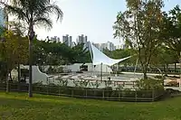 The new town currently had a public auditorium and theatre, Tai Po Civic Centre, which was opened in 1985 on On Pong Road,[19] next to private housing estate Tai Po Centre. A larger facility, Tai Po Town Hall (大埔大會堂), which could compare to Sha Tin Town Hall, was planned in the new town, east of private housing estate Plover Cove Garden (寶湖花園). However, the construction of such facility was scrapped or postponed indefinitely.[20] Another facility, Tai Po Public Library, was separated from the planned town hall, and incorporated into Tai Po Complex, a new government building that was completed in 2004.[21] The complex was a re-development project within the older area of Tai Po in Tai Po Market. Government had used part of the shopping centre of Plover Cove Garden as the temporary site of the public library for more than a decade. In 2016, government proposed to built Tai Po Sports Centre, Tai Po Community Hall and two 7-a-side football fields,[22] on the existing planned site of Tai Po Town Hall.