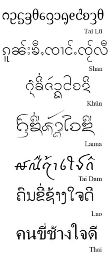 - Southwestern Tai: Ahom, Shan, Dehong, Tai Theeng (Nghe An), Black Tai, White Tai, Padi, Lao, Thai