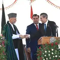 The Tajikistan-Afghanistan bridge spanning the Panj River between Panji Poyon (or Nizhniy Pyandzh), Tajikistan and Sherkhan Bandar, Afghanistan was opened on 26 August 2007.[1][2][3] The two lane bridge is 672 metres (2,205 feet) long and 11.6 metres (38 feet) wide. It cost approximately $40 million, financed by the US Army Corps of Engineers and was designed and constructed by an Italian company, Rizzani de Eccher S.p.A. The Tajik President Emomali Rahmon and Afghan President Hamid Karzai were joined by US Secretary of Commerce Carlos Gutierrez at the opening ceremony.