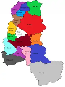 | Khwaja Ghar | 77,516 | 402 km2 | 62 villages 80% Tajik.[26] | |