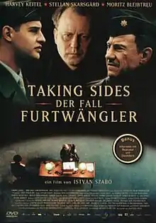 Taking Sides (German title Taking Sides – Der Fall Furtwängler) is a 2001 German-French-Austrian-British[1] biographical drama film directed by István Szabó and starring Harvey Keitel and Stellan Skarsgård. The story is set during the period of denazification investigations conducted in post-war Germany after the Second World War, and it is based on the real interrogations that took place between a U.S. Army investigator and the musical conductor Wilhelm Furtwängler, who had been charged with serving the Nazi regime. It is based on the 1995 play of the same title by Ronald Harwood.