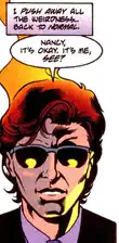 The problem was that unlike a New God, Takion has cosmic awareness but has to filter this awareness and all the information it brought using the primitive thought structures of a human brain. This dissonance was making him unstable. He spent his time in space learning how to separate the future and past from the present, and forcing his awareness to exist only in the present. He allowed his body to discorporate so that he could re-assemble himself, which is when he first discovered the ability to possess others, read their minds and also their potential timeline and destiny. Takion also learned how to accept and use his cosmic awareness.[4]