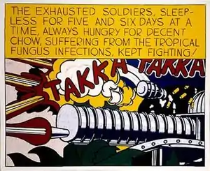 Lichtenstein was a trained United States Army pilot, draftsman and artist as well as a World War II (WWII) veteran who never saw active combat.[3][4] The work depicts a machine gun firing as it is situated above the camouflage of palm fronds during the Battle of Guadalcanal. The image shows shell casings and a grenade in mid flight. An explosion is stylized with the titular phrase.[2] The source of Takka Takka is the comic book Battlefield Action #40 (February 1962, Charlton Comics Group).[5]