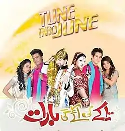 Takkay ki Ayegi Baraat is a Pakistani comedy-drama that aired on Geo TV from June 2011 to October 2011. The third instalment of its kind, it is a continuation of the hit Dolly ki Ayegi Baraat[1] in the Evernew's popular storyline of Kis Ki Ayegi Baraat. The show includes most of the characters from Dolly ki Ayegi Baraat, and focuses on the story of Mustaq a.k.a. Takkay and Sila's friend Sukena. Takkay ki Ayegi Baraat is written by Vasay Chaudry who had co written the previous serial as well. The character of Sila, previously played by Sarwat Gilani and Ayesha Omar in the first and second serials respectively, is played by Alishba Yousuf. This is the third time the character of Sila has been played by a different actress. And the character of Azar (played by Hassan Niazi in the previous two serials) is now played by Ahsan Khan.