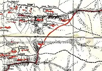 At the beginning of 1962, the Chinese activity along the border increased again.[20] India strengthened its border post at Taksing by a platoon. In June, a dozen tribesmen from Lengbeng (Lingbing) village stole some arms from the Taksing post, allegedly under Chinese persuasion. They were intercepted and a tribesman was killed in the ensuing clash.[21] On 23 October, the war began with the Chinese troops attacking with superior force. The Asaphila post, manned by Jammu and Kashmir Rifles, lost one JCO and 17 other ranks. After this, all the Indian border posts were ordered to withdraw to Taliha. It is believed that the Chinese would have occupied all the vacated posts.[19] On 16 November, two thousand Chinese troops were found in the Gelensiniak area equipped with heavy weaponry.[22]