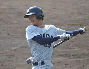 He was regular catcher at Aoyama Gakuin University from fall of his first year where he learned to adapt his release from behind the plate to catch faster, more skilled runners.[2]