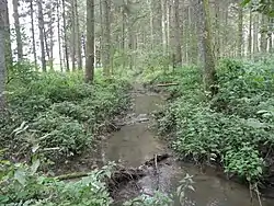 The Talbach originates a quarter of a kilometre south of the village border of Engelswies, in the Inzigkofen municipality on the eastern slope of Talsberg at just 665 m above sea level in the middle of fields. First of all, flowing eastward, the stream creates a nearly one and a half kilometer long northern arc, and then it flows south. After continuing for almost the same distance again, mostly on the edge of the forests Kohlhau and Hartwald, it reaches the mouth of Kaibach, the first major inlet, which joins the stream from the right as the Talbach enters the forest. Immediately afterwards the stream becomes a swampy brook . The stream sporadically emerges and disappears again, flowing through the valley section of the forest, and through the natural monument stone gutter ("Felsentäle") in the Hartwald. The stream then continues in a westerly direction and picks up the almost equally long Annenbach from the right, at the edge of the forest. In the corridor, the shorter Krebsbach flows out of the Hartwald into the Talbach, which is already near the northern outskirts of Menningen. The Weiherbach inlet then joins the stream from the northeast, at which point, the Talbach pivots. After another approximately 700 meters, it flows through the village, joining the Ablach from the left about 592 m above sea level.