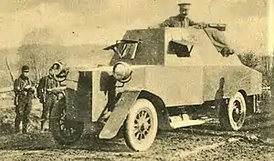 First Admiralty pattern armoured cars were unpopular with their crews because the crew members in the fighting compartment were completely exposed from the waist up, so to incorporate lessons learned in combat by R.N.A.S. armoured car crews six modified first Admiralty pattern cars were created to increase crew protection, the modifications were conducted the firm Forges et Chantiers de France at Dunkirk under the supervision of Lieutenant F. R. Samson using armour plate dispatched from England by the Admiralty in October 1914.[1][3][4] By the time they came into service in the first week of November 1914 most of the Western Front had descended into trench warfare and the opportunities for their employment were almost gone, so they were sent to the still open La Bassée area to be trialled in combat.[3]