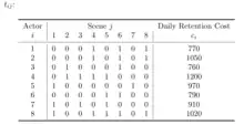 Consider a film shoot composed of shooting days and involving a total of actors. Then we use the day out of days matrix (DODM) to represent the requirements for the various shooting days. The matrix with the entry given by: