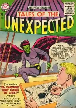 In response to the restrictions imposed by the Comics Code Authority, DC began a new science-fiction series in 1956.[1] The series featured artwork by Murphy Anderson, Gil Kane, and many others, with stories by John Broome, Gardner Fox, and additional writers. It was an anthology comic for many years, publishing a variety of science fiction stories.[2] The series featured Space Ranger as of issue #40[3][4] and running through #82 (April–May 1964).[5] Other features included the "Green Glob" (issues #83–98, 100, 102, 103) and "Automan" (issues #91, 94, 97).[5] The series' last issue as Tales of the Unexpected was #104 (December 1967–January 1968).[5] As of issue #105 (February–March 1968), the title was shortened to The Unexpected.[6][7]
