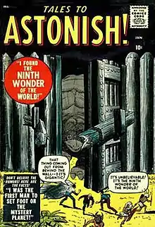 Tales to Astonish and its sister publication Tales of Suspense were both launched with a January 1959 cover date.[2] The early run of the first volume of Tales to Astonish ran from issues #1–34 (January 1959 – August 1962), initially under Atlas Comics, the 1950s forerunner of Marvel;[3] it fell under the Marvel banner with issue No. 21 (July 1961), the first with a cover sporting the early "MC" box.[4] It contained science-fiction mystery/suspense stories written primarily by editor-in-chief Stan Lee and his brother, Larry Lieber, with artists including Jack Kirby, Steve Ditko, Dick Ayers, Don Heck and Paul Reinman. One such story, "The Man in the Ant Hill", in No. 27 (January 1962), introduced the character Henry Pym,[5] who would be repurposed eight issues later as the superhero Ant-Man. Anthological stories continued to appear as backups until Tales to Astonish became a superhero "split book" in 1964, when it began featuring one story each of Giant-Man and the Hulk.[3][6]