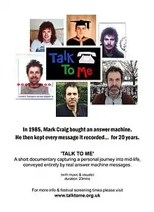 Talk To Me is a 2006 British documentary film directed by and starring Mark Craig.[2][3][4][5][6][7][8] The film won 'Best Short Doc' upon its debut at the Boulder International Film Festival in 2006.[9]