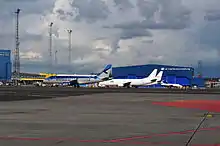 On 20 March 2013 the airport authorities announced a public procurement for constructing a new hangar complex. The cornerstone of the new complex was laid on 27 September 2013.[68] It has a surface area of 5,230 m2 (56,300 sq ft), is located right next to the existing General Aviation Terminal and will be servicing aircraft within a distance of up to 3,000 kilometers from Tallinn. The complex is intended for accommodating a total of nine planes, eight of them are mid-size business jets and one aircraft the size of a large corporate aircraft. It consists of five hangars: the Hangar 1 for the large aircraft (such as Boeing 737, Airbus A318 or Airbus A319), hangars 2 to 5 are intended for smaller business jets (Bombardier Challenger 605, Learjet 60). The whole complex was opened on 15 April 2014[69] and its operator is Panaviatic, which is going to expand its business jet operations from Tallinn Airport.[70] Apart from providing hangarage for business jets, the new complex also offers MRO services by Panaviatic's subsidiary AS Panaviatic Maintenance.[71] The total investment was close to 5 million euros and the whole complex is the largest in the Baltic states.[69]