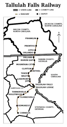 The Tallulah Falls Railway, also known as the Tallulah Falls Railroad, "The TF" and "TF & Huckleberry," was a railroad based in Tallulah Falls, Georgia, U.S. which ran from Cornelia, Georgia to Franklin, North Carolina. It was commissioned by the Georgia General Assembly on January 27, 1854, and conducted its final run on March 25, 1961.