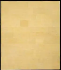 This painting is part of an early series that Gallagher created examining minstrel shows. Sheets of penmanship paper are adhered to a canvas. Neutral colored oil paint and blue pencil emphasizes the lines on, and color of, the paper. Lightly drawn symbols decorate the pieces of paper, including drawings of red lips and eyeballs which represent early stereotypes of African American peoples.[1]