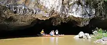Tam Cốc, literally "three caves", consists of three natural caves — Hang Cả, Hang Hai, and Hang Ba — on the Ngô Đồng River.[2] Tourists are taken in small boats along the river from the village of Ván Lám, through rice fields and limestone karsts, through the caves, and back. Local women serve as guides and attempt to sell embroidered goods to their passengers. The guides are well known for rowing their boats using their feet.[3]