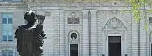 The statue is positioned on a base of Vermont marble and measures 96 by 59 by 46 inches (2.4 m × 1.5 m × 1.2 m). The area between the figurehead and Bancroft Hall is called T-Court.[5] In 1930, the wooden "heart" and "brains" of the original statue were transferred to the bronze statue.[1]
