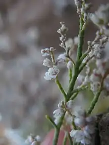 Tamarix usneoides, locally known as wild tamarisk, is a twiggy shrub or small evergreen tree that grows in saline habitats, semi-deserts and karroid areas in southern Africa. It has a short trunk, thin branches usually growing from ground level, tiny scale-like leaves and spikes of creamy-white flowers.