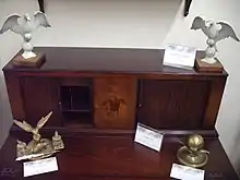 A tambour desk is a desk with desktop-based drawers and pigeonholes, in a way resembling bureau à gradin. The small drawers and nooks are covered, when required, by reeded or slatted shutters, tambours, which usually retract in the two sides, left and right. It is a flatter and "sideways" version of the rolltop desk.