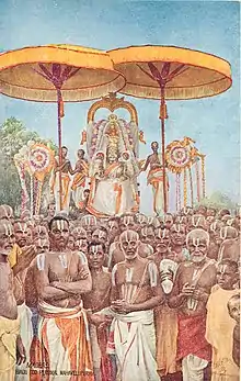 Perumal (Tamil: பெருமாள்), also Tirumal (Tamil: திருமால்), is the Hindu deity venerated in the Sri Vaishnavism sect of Hinduism.[15] Perumal is considered to be another name of Vishnu, and was traditionally the deity associated with the forests.