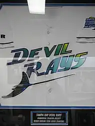 During their first three seasons, the Devil Rays wore traditional white home and gray road uniforms with the text "Devil Rays" (home) and "Tampa Bay" (road) in an unconventional multicolor "rainbow" across the chest. The intended inaugural caps were also unusual: black with a purple brim at home and all black on the road, with both versions featuring a devil ray graphic and no letters at all.[76] However, for most games, the team wore their all-black alternate caps, featuring a smaller ray and the letters "TB" for both home and road games, with the purple-brimmed caps only occasionally seeing use late in the season. During the 1999 and 2000 seasons, the Devil Rays wore an alternate black jersey featuring the same rainbow text as the white and gray uniforms.