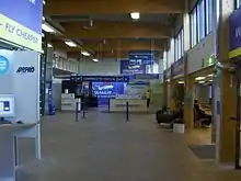 Tampere–Pirkkala Airport (IATA: TMP, ICAO: EFTP; Finnish: Tampere-Pirkkalan lentoasema, Swedish: Tammerfors-Birkala flygplats), or simply Tampere Airport, is located in Pirkkala, Finland, 7 nautical miles (13 kilometres; 8.1 miles) south-west[2] of Tampere city centre. The airport is the 14th-busiest airport in Finland, as measured by the total number of passengers (8,391 in 2021), and the eighth-busiest as measured by the number of international passengers (7,979 in 2021).[1]