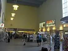 Only very few changes have been made to the Tampere railway station over the years. In contrast, the area around the station has changed. In 1983, a shopping and parking building was built on the south side of the station. In 1989, a 98-metre shopping tunnel, known as Asematunneli (station tunnel) was built throughout the station building, containing about twenty shops. Thus pedestrians no longer had to use the cramped and noisy underpass at Itsenäisyydenkatu. At the same time, the station's ticket office moved to its new premises. A new storage area for luggage was built next to the ticket office in 1994. The new Matkakeskustunneli tunnel passing under the railway yard was built in 2008,[3] and in 2012 a third, 60-metre long Pendolino tunnel parallel to the railway tracks was built, connecting the two previous tunnels.[14][15] The Pendolino tunnel was closed for passage in 2016.[16] In 2012 a new 75-metre long underpass tunnel under Rongankatu was opened for the use of pedestrians and bicyclists to help travel between Tammela and the city centre. The tunnel has elevator and stair connections to all platforms.[17]