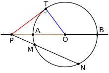 - A circle is drawn centered on the midpoint of the line segment OP, having diameter OP, where O is again the center of the circle C.
