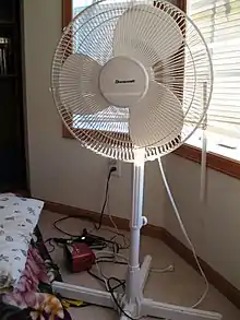 Between 1882 and 1886 Schuyler Wheeler invented a fan powered by electricity.[9] It was commercially marketed by the American firm Crocker & Curtis electric motor company. In 1885 a desktop direct drive electric fan was commercially available by Stout, Meadowcraft & Co. in New York.[10]