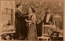 Tangled Lives is a 1910 American silent short drama produced by the Thanhouser Company.[1] The plot focuses on, John Hill, a bank cashier who decides to fakes his death after the manager finds his accounts are short. Before he can go through with the plan, a reporter interviews the wife, May, and decides to suppress the story because he has become infatuated with her. Five years pass, May and the reporter decide to marry, but John returns on the day of the wedding. Upon sneaking into the house, he sees their love and decides to disappear. As he attempts to leave he accidentally falls to his death and the reporter removes his body before he leads May to the altar. The film was described as a variant of Enoch Arden by one reviewer, but it differs in its execution. The cast and credits of the film are unknown, but a surviving film still shows the principal characters. The film was released on September 13, 1910, to positive reviews. The film is presumed lost.