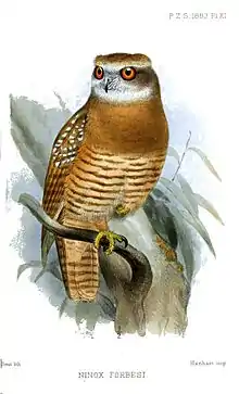 The Tanimbar boobook, or Tanimbar hawk-owl (Ninox forbesi), is a species of owl in the family Strigidae. It is found in the Tanimbar Islands of Indonesia. Its natural habitat is subtropical or tropical moist lowland forests. It is threatened by habitat loss. It used to be considered a subspecies of the Moluccan boobook.