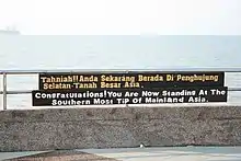 Tanjung Piai (Jawi: تنجوڠ ڤياي) is a cape in Pontian District, Johor, Malaysia. It is the southernmost point of Peninsular Malaysia and thus the most southern point of mainland Eurasia. The skyline of Singapore is visible across the Johor Strait from the point. It features seafood restaurants, perched on wooden jetties that are surrounded by a rugged and rarefied coastline of unspoiled mangrove forests.