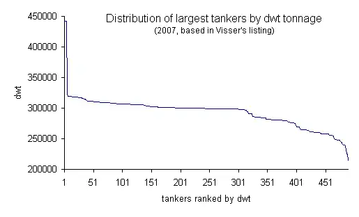 At nearly 380 vessels in the size range 279,000 t DWT to 320,000 t DWT, these are by far the most popular size range among the larger VLCCs. Only seven vessels are larger than this, and approximately 90 between 220,000 t DWT and 279,000 t DWT.[5]