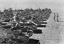 The outbreak of war in 1939 led to a significant expansion of Australia's armoured force. At the start of the war, due to the limitations of the Defence Act (1903), which prevented the government from sending the Militia to fight outside Australian territory, it was decided to raise an all-volunteer force to serve overseas. This force was known as the Second Australian Imperial Force (2nd AIF),[19] and many of the 1st Light Horse (Machine Gun) Regiment's members volunteered and were assigned to the 2/2nd Machine Gun Battalion, they took part in the fighting in the Mediterranean theatre.[20] With the Australian Army only possessing a total of fourteen tanks – 10 Mark VIs and four Mark IIs[21] – orders for modern types were quickly placed in Britain and the United States.