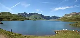 Tannensee is a reservoir in Obwalden, Switzerland. In 1958, Tannenbach and few other creeks were dammed with an earth-fill dam. The reservoir has a volume of 3.8 mio m³ and its surface area is 33 ha (82 acres). The reservoir is used to generate electricity at Kraftwerk Hugschwendi in Kerns.